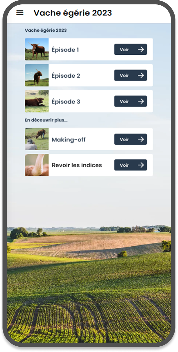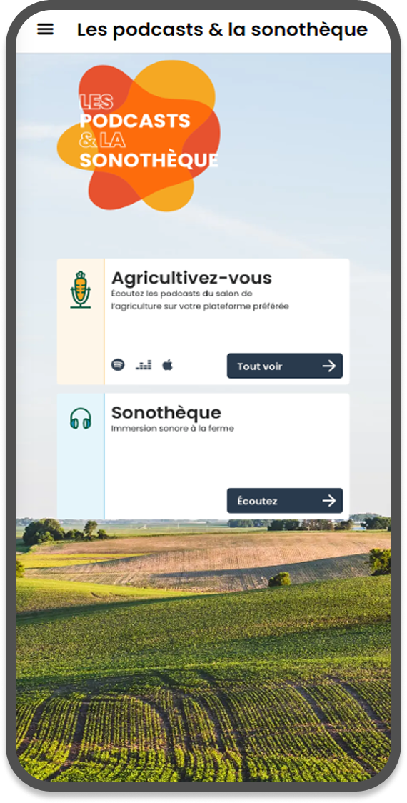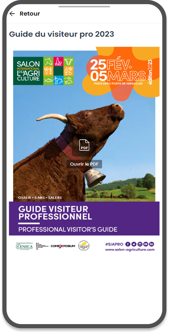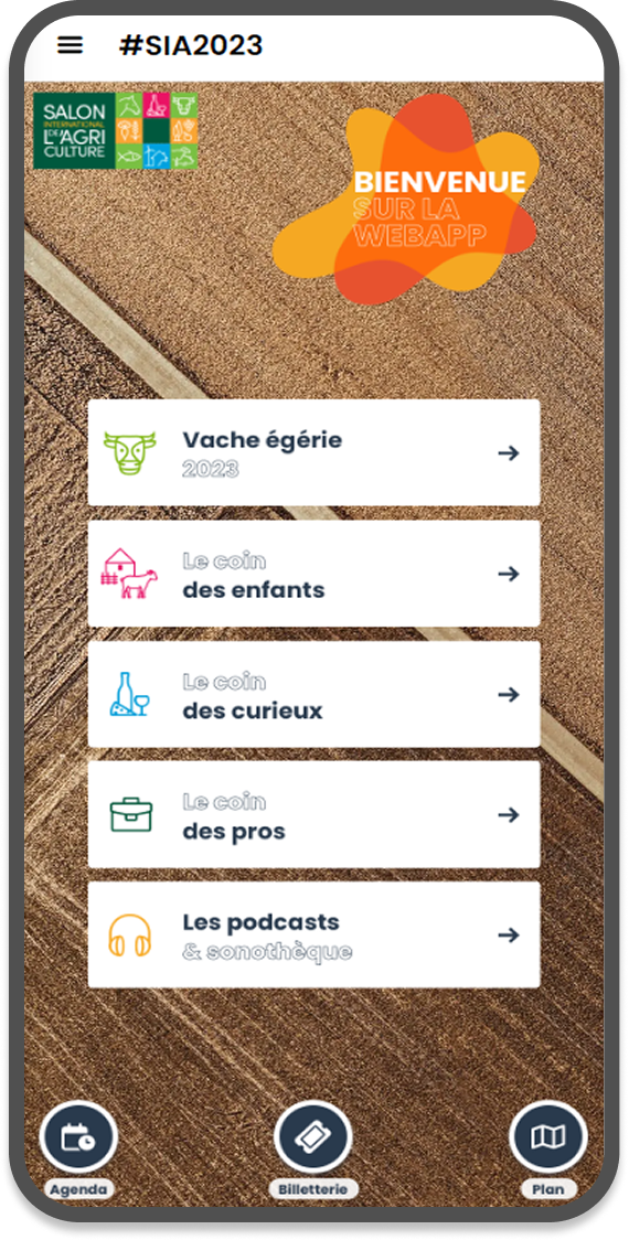 L’édition 2023 a proposé un teasing de la vache égérie qui a très bien fonctionné en amont du salon (+ 50 000 connexions à la webapp). Sur place, on retrouvait ensuite sur la webapp un coin des enfants avec des mini-jeux mais aussi des jeux pour les adultes (coin des curieux) et une page dédiée aux professionnels. Une sonothèque et des podcasts ont également été diffusés via la webapp. Des iframe permettaient d’avoir accès à l’Agenda ou le Plan du Salon.