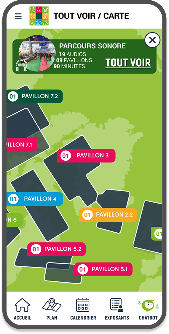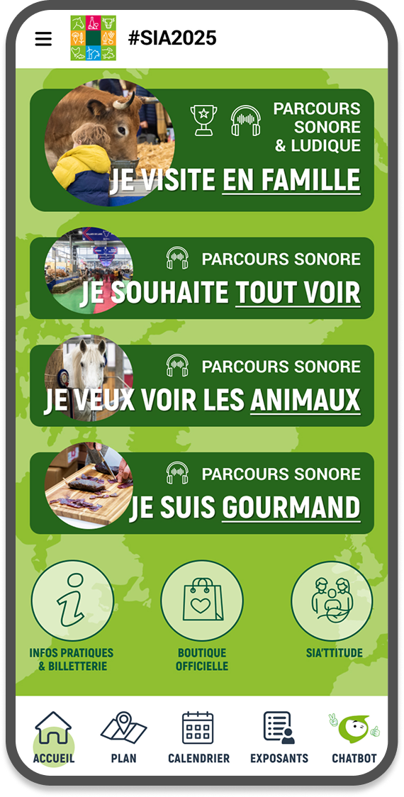 Depuis 2022, Comexposium fait confiance à Yunow pour la réalisation de sa web application officielle pour le Salon International de l’Agriculture. L’édition 2025 confirme ce succès avec plus de 70 000 connexions ! Cette refonte reprend l’identité visuelle de l’affiche 2025 et met davantage en valeur les parcours audioguidés avec notamment une signalétique dédiée sur place. On retrouve toujours des contenus intégrés : plan, calendrier, exposants et chatbot.