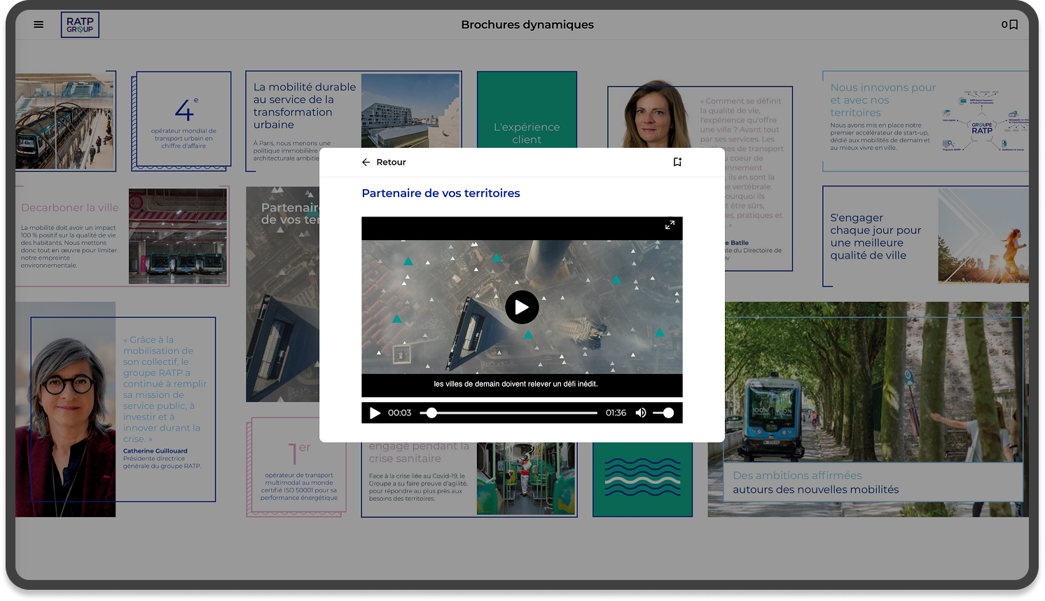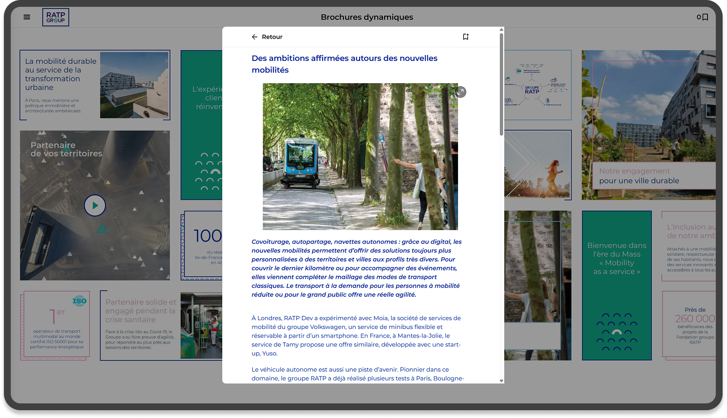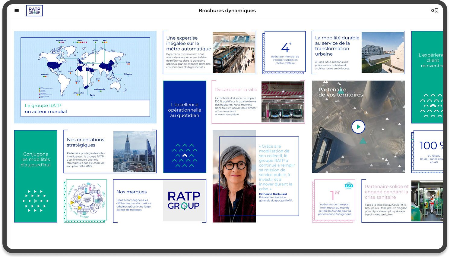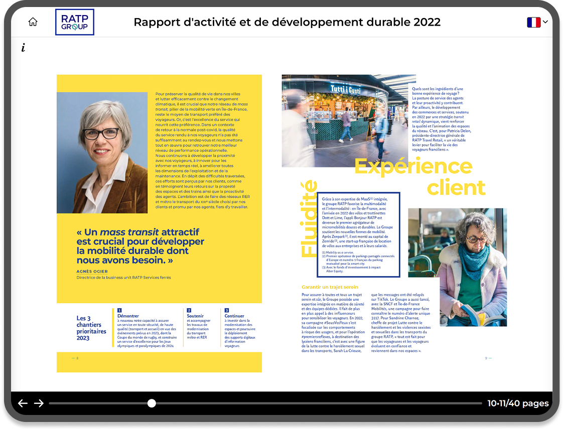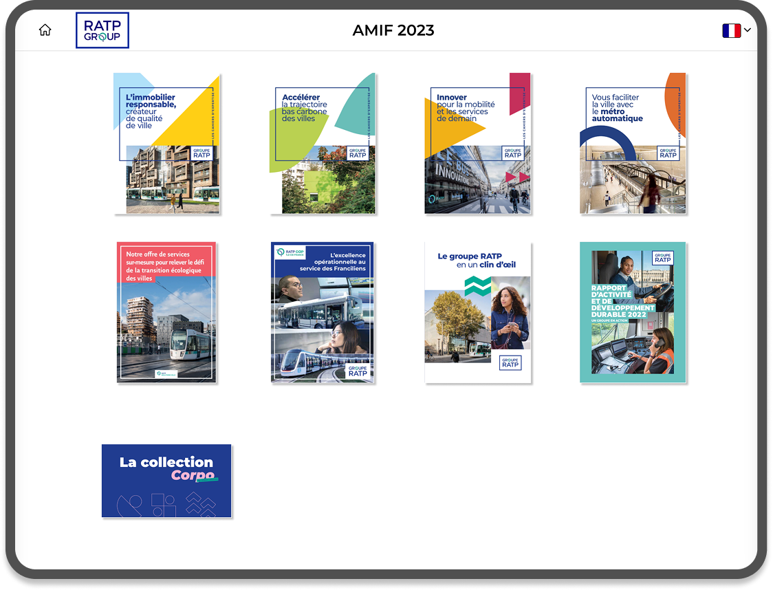 La RATP a fait appel à Yunow pour présenter son catalogue commercial grâce à une application. Cette appli permet de naviguer efficacement à travers des brochures, les manipuler, et découvrir les informations présentées par le groupe.