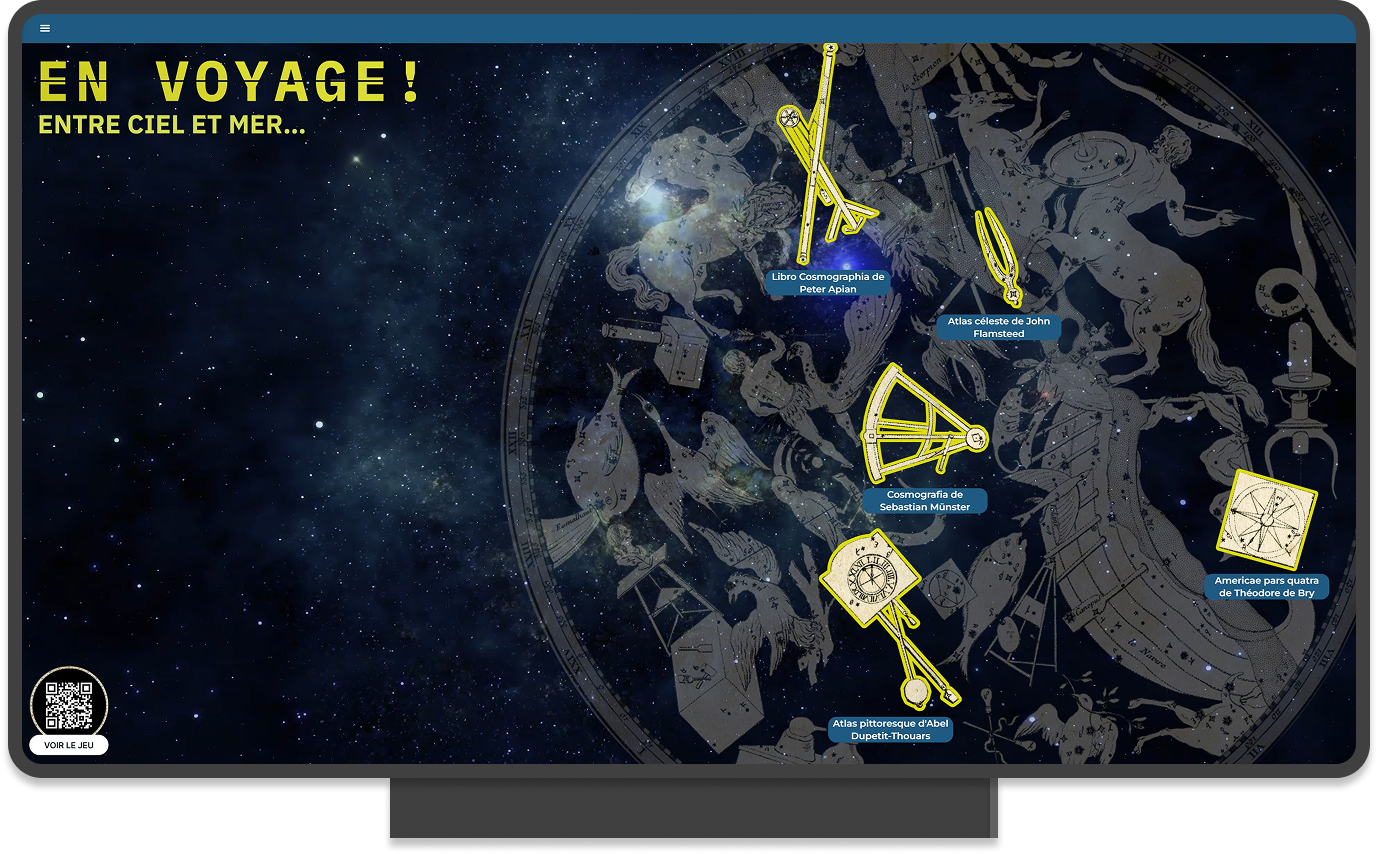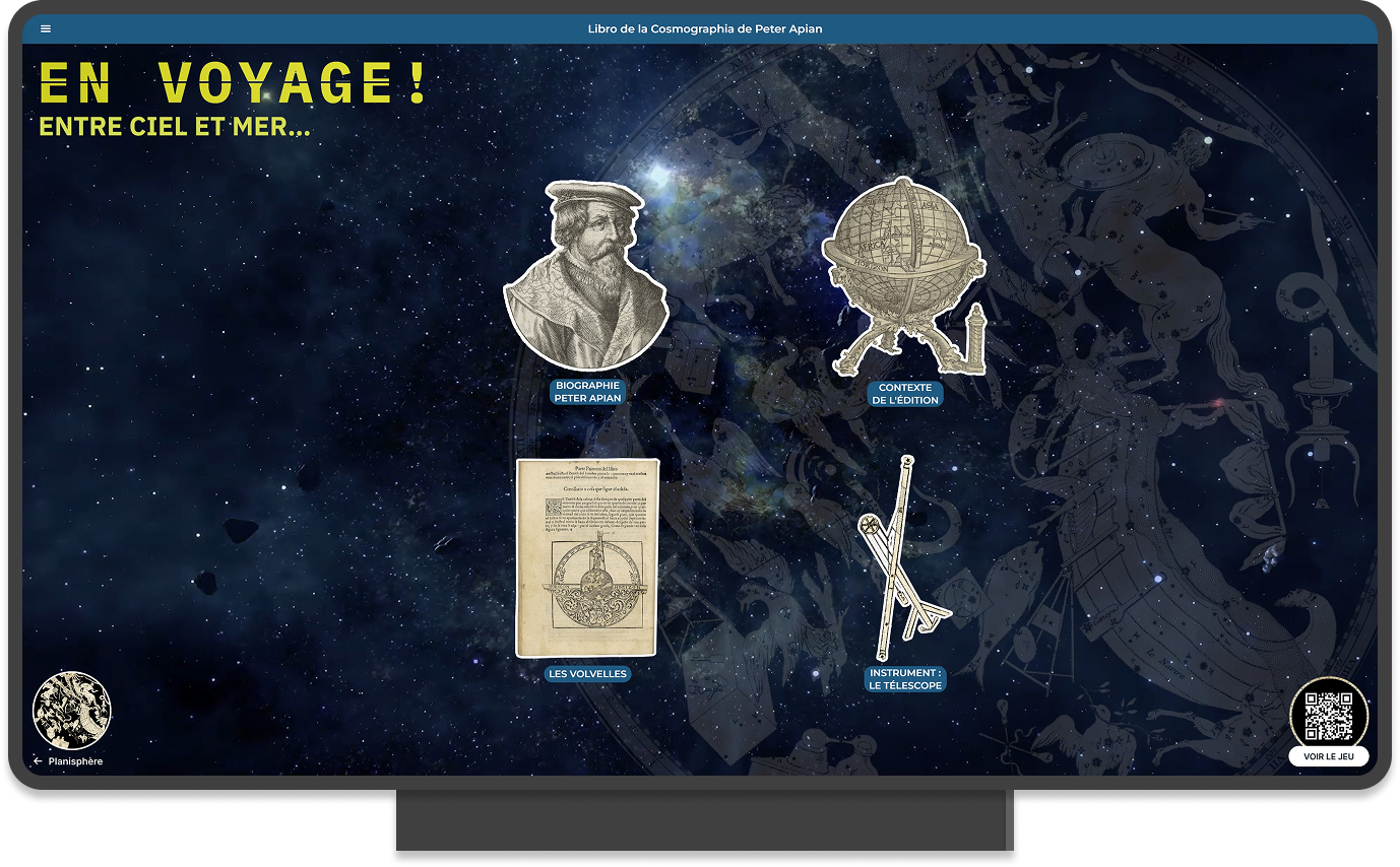 - Une première application pour table tactile présente une sélection d’ouvrages rares et leur auteurs sur l’astronomie dont l’un est consultable en intégralité grâce à un feuilletoir.