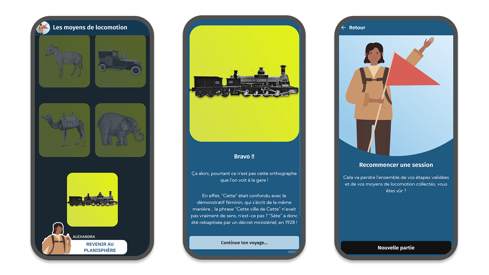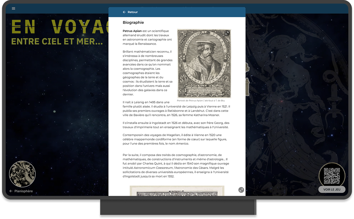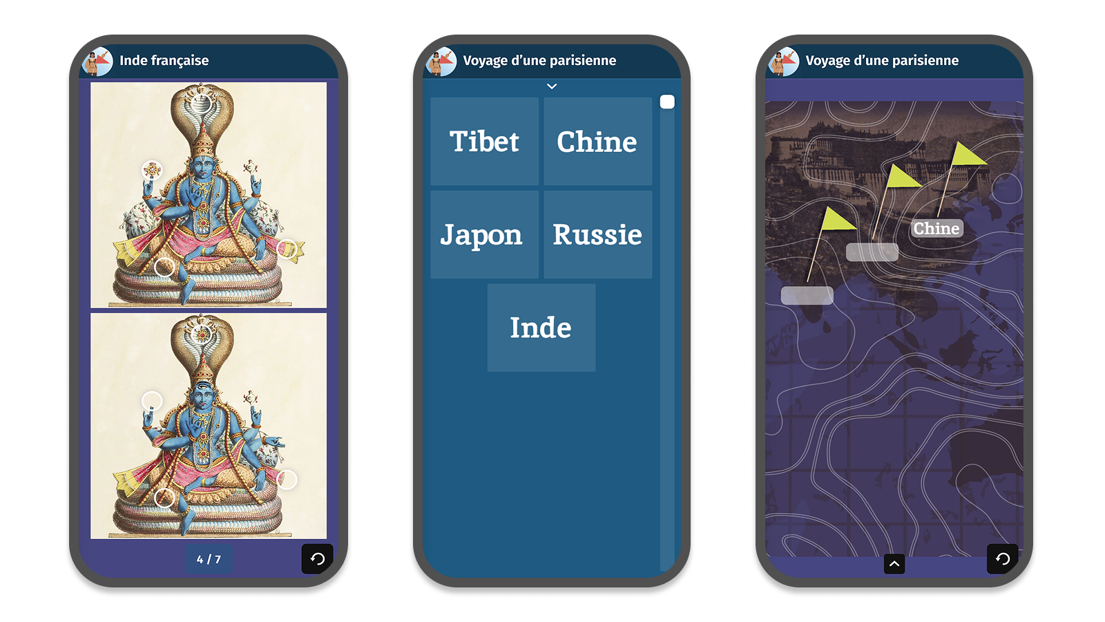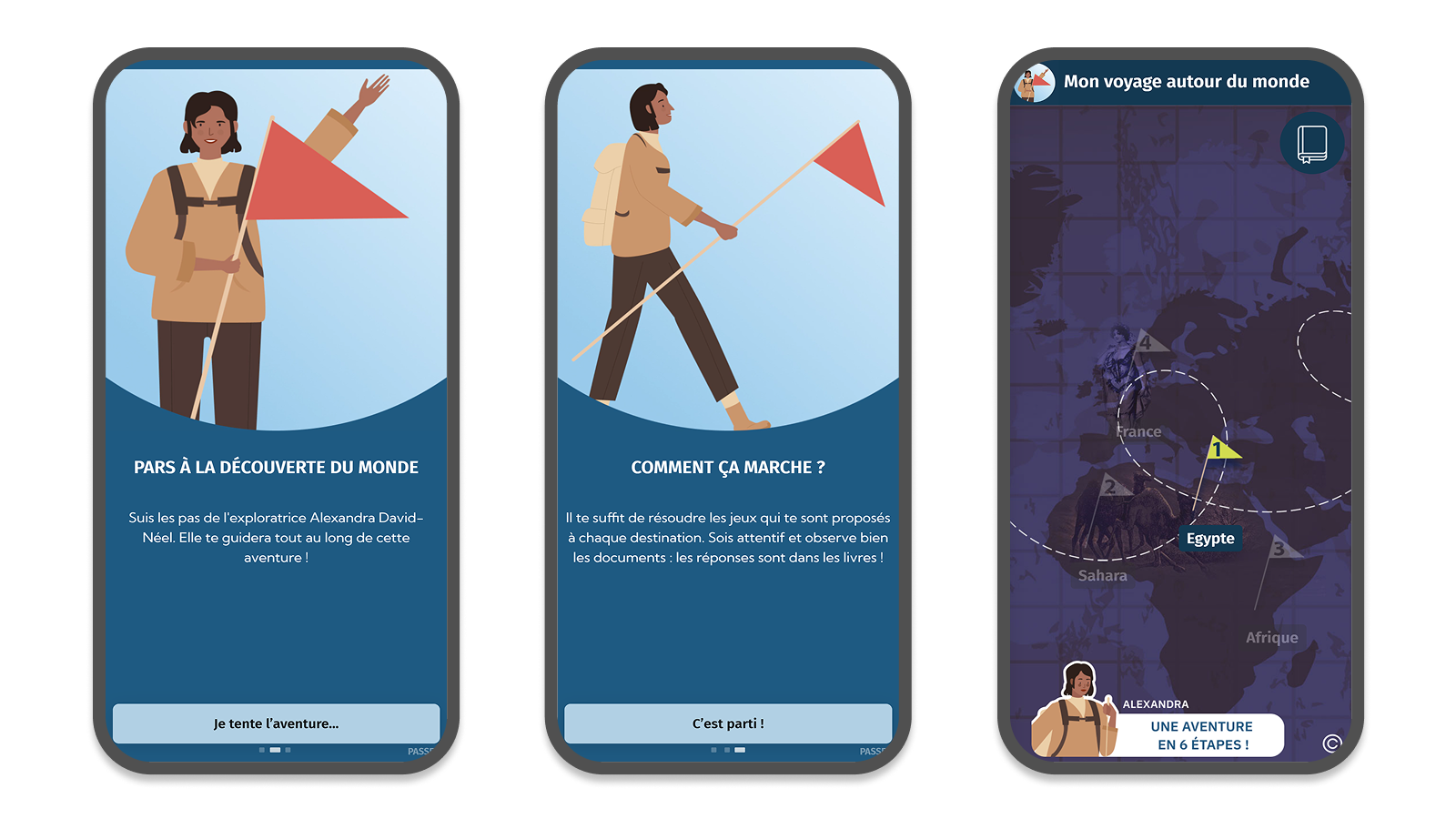 - La deuxième application est un jeu de piste accessible sur smartphone en flashant un QR Code. Une exploratrice guide le joueur dans 6 étapes de mini-jeux permettant de débloquer des fiches-contenus.