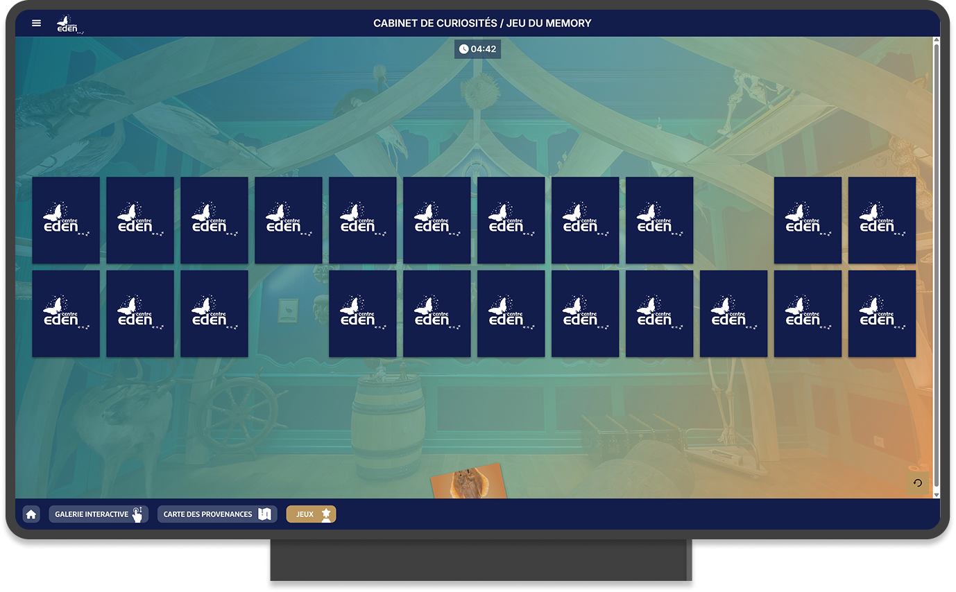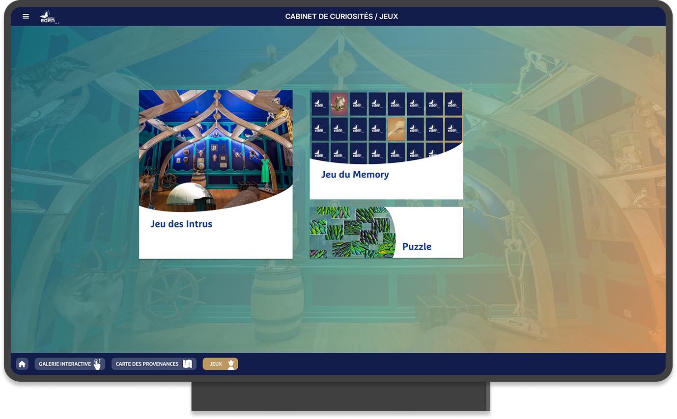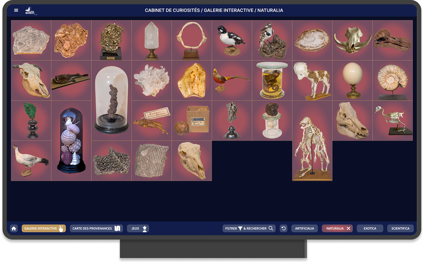 L’équipe de Yunow a réalisé pour le centre Eden à Cuisery, un site culturel du département de Saône et Loire, une application sur-mesure pour sa table tactile située au coeur de son Cabinet de curiosités. Cette galerie dynamique présente près d’une centaine d’objets sous la forme de fiches détaillées. Les contenus sont filtrables par un moteur de recherche complexe proposant l’ensemble des catégories et affichables par les quatre classifications des cabinets de curiosités. Une carte des provenances permet également de situer le pays de fabrication ou de collecte des objets.