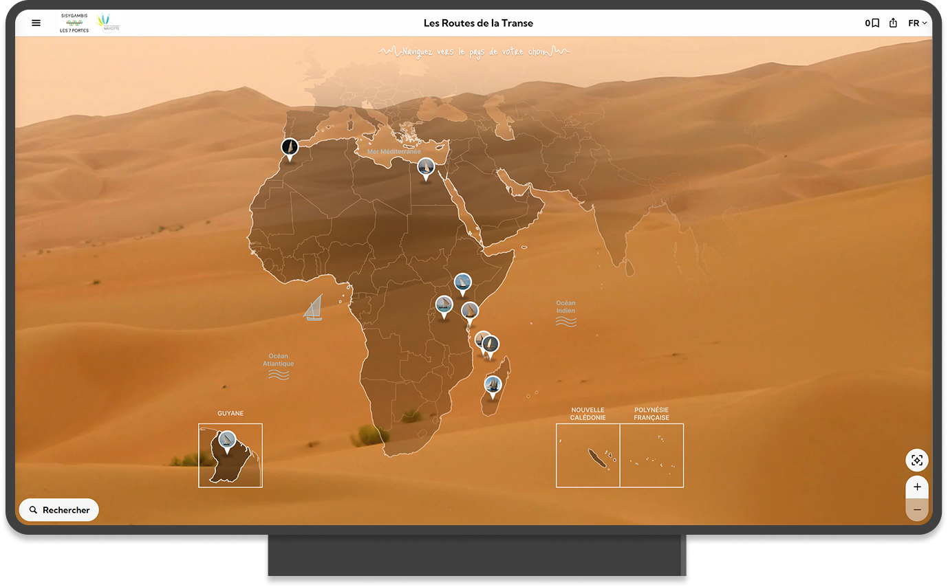 En partenariat avec le Centre universitaire français de Mayotte, le centre artistique et de production multimédia Sisygambis Les 7 portes développe un web documentaire sur les Routes de la Transe. Voyage virtuel, audiovisuel et sonore, à travers le monde des Suds, sous forme d’escales interactives, traduites en trois langues.
