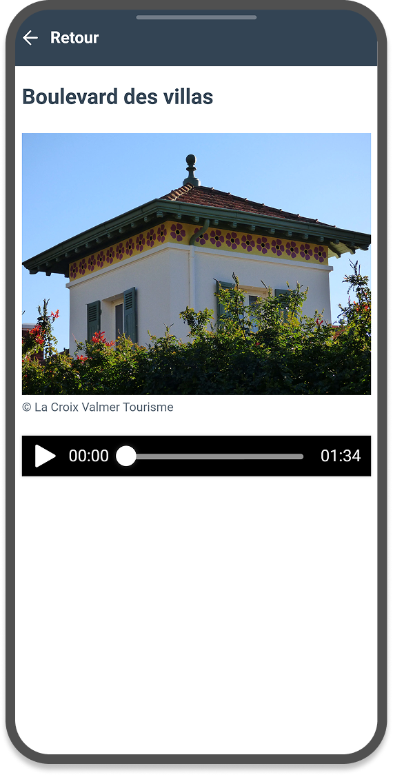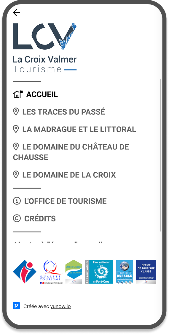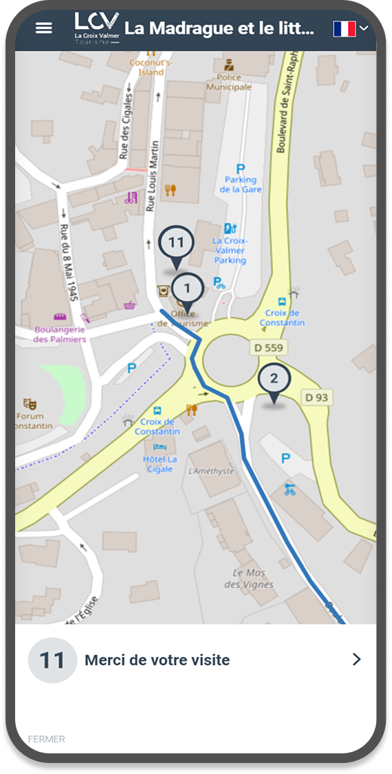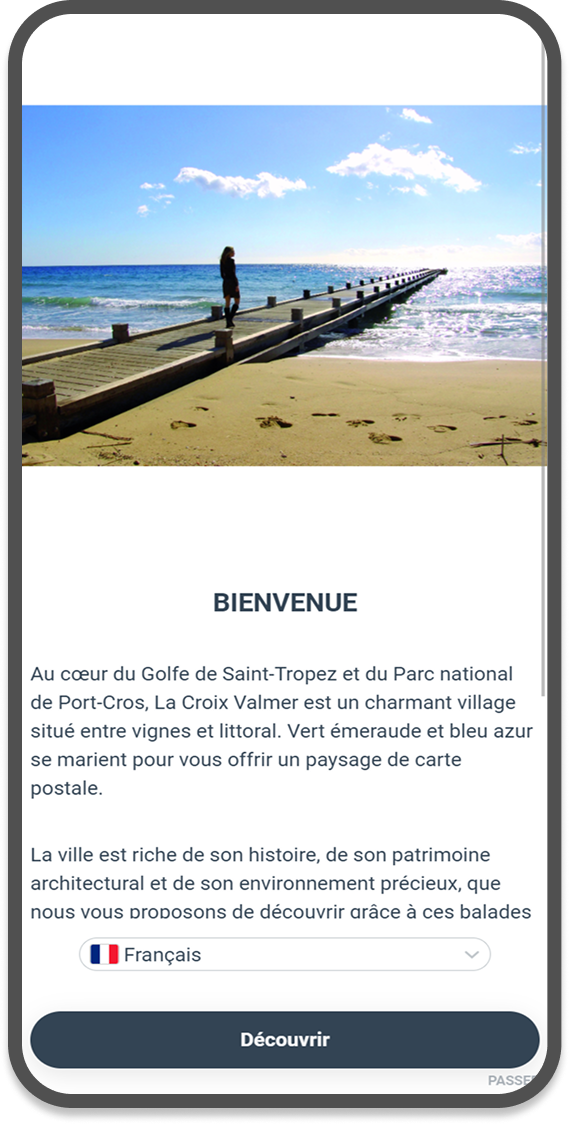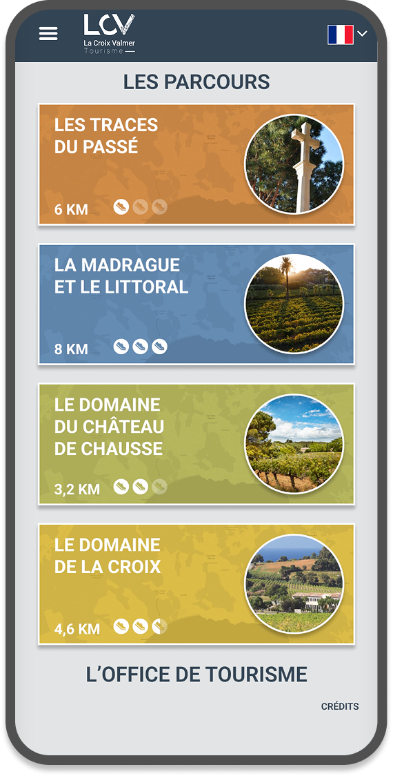 Nous avons créé une application de parcours audioguidé pour l’office de tourisme de La Croix Valmer dans le Var. Un menu permet d’accéder à 4 parcours sur une carte interactive où l’utilisateur peut se géolocaliser. Chaque parcours comporte un tracé coloré (au format Geojson) et une dizaine de points d’écoute. L’application est entièrement traduite en 3 langues, auquel on accède très facilement depuis la barre de menu.
