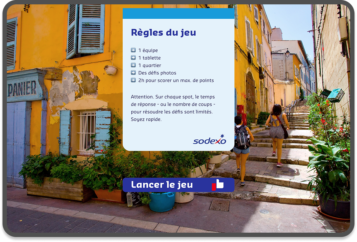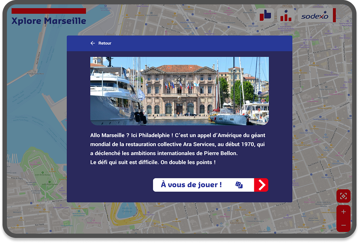 Nous avons imaginé un rallye pédestre interactif qui invite à voir la ville autrement et à décrypter l’histoire de Sodexo, en équipe, en 23 points d’intérêts ludiques et interactifs.