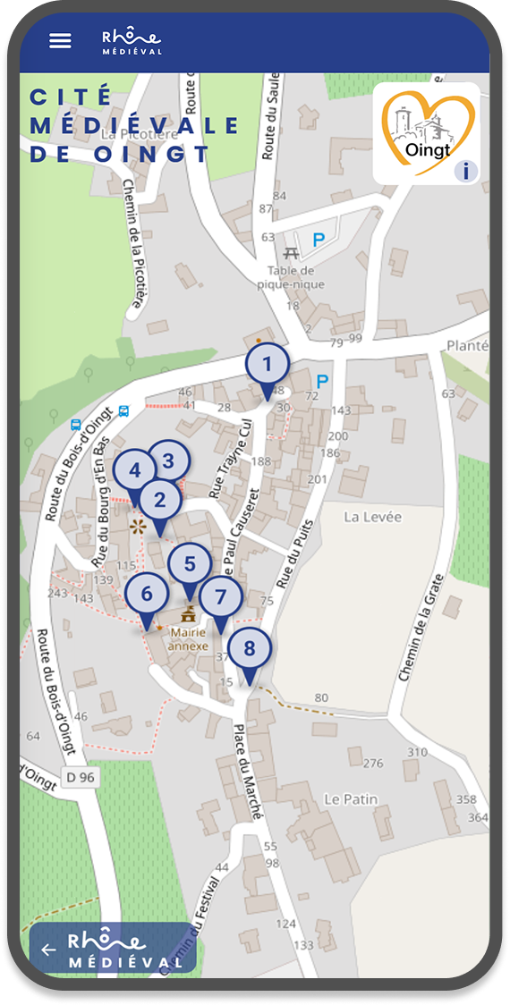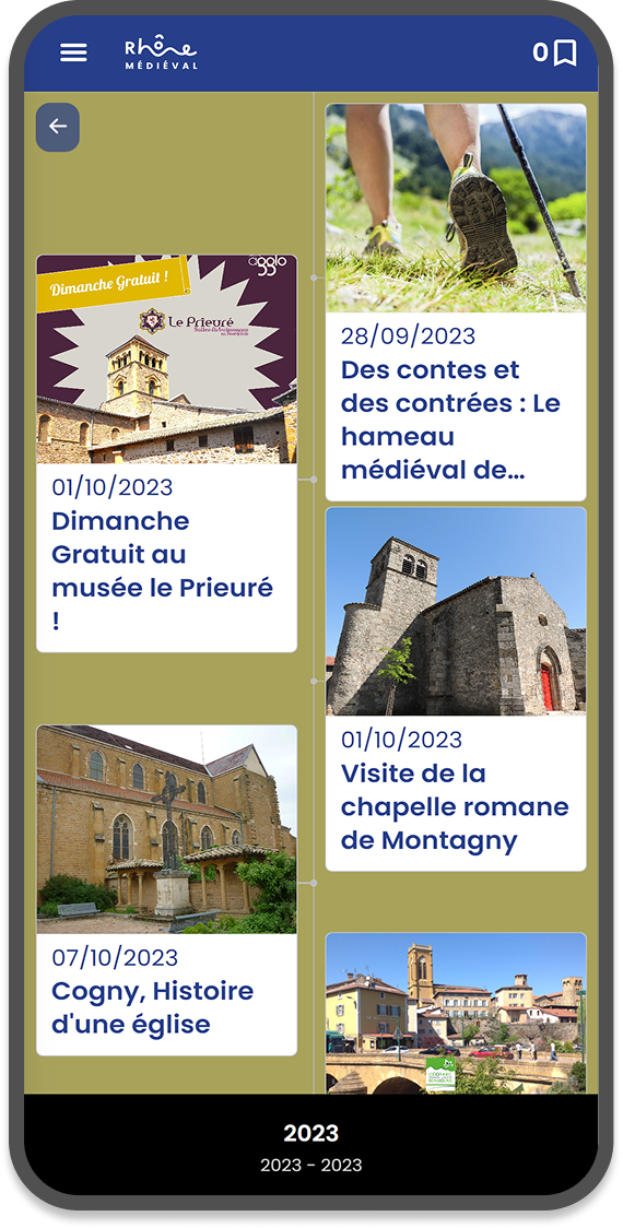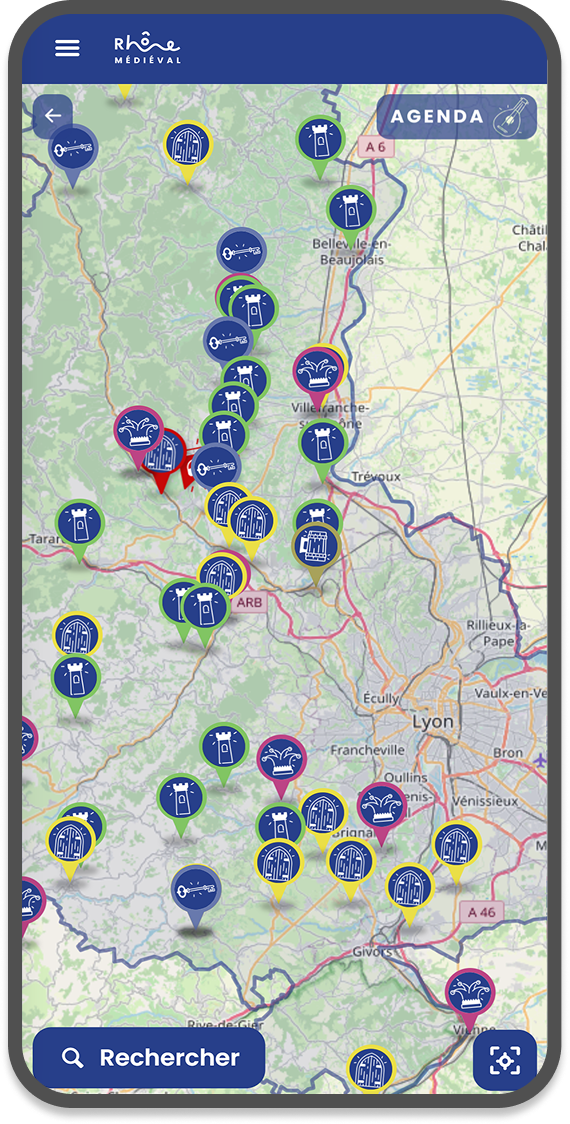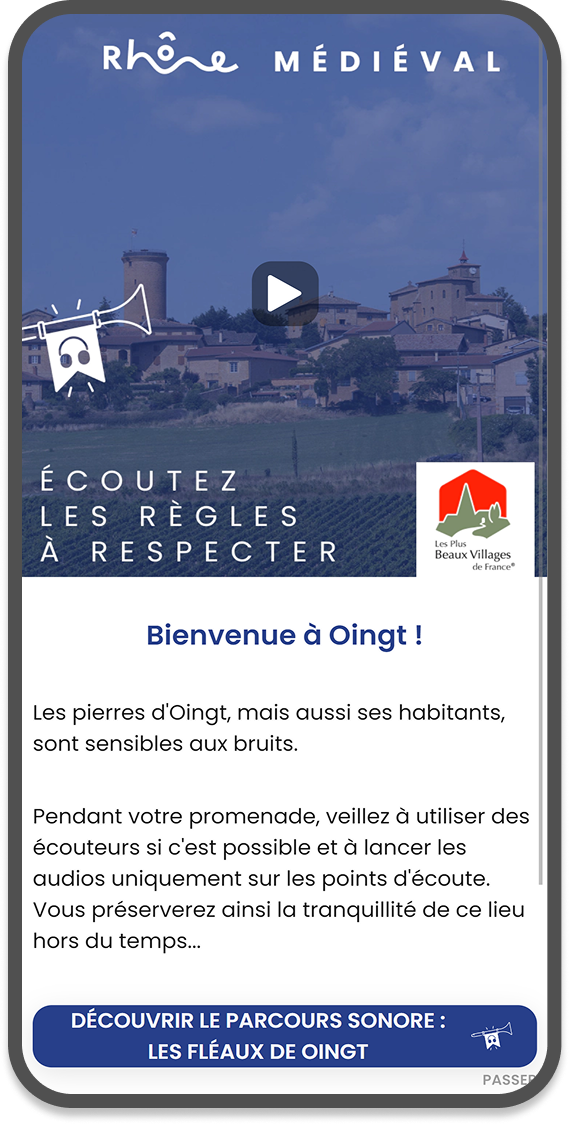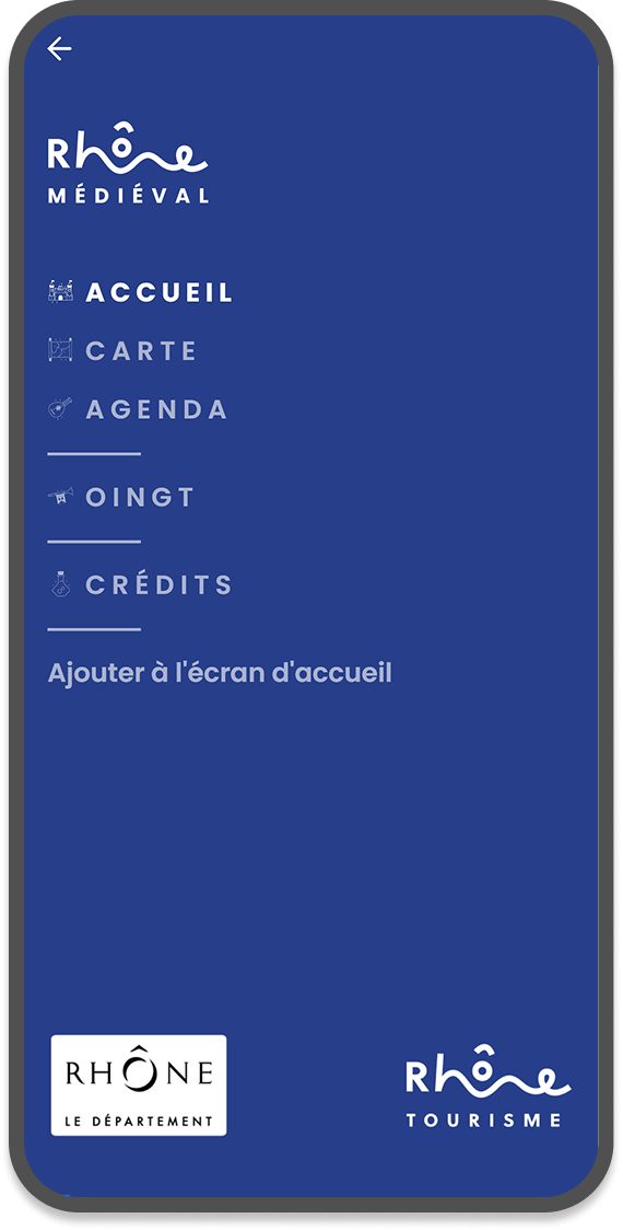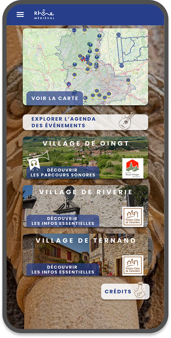 Audiovisit a renouvelé sa confiance à Yunow pour un 11e projet en 2023. Avec l’institution Rhône Tourisme nous avons créé une application de type portail thématique sur le médiéval dans le département du Rhône. Une carte interactive permet de positionner précisément une centaine de lieux (villages, sites, restaurant, activités...) avec une fiche d’informations. Un agenda permet d’afficher les événements en lien avec la thématique. Enfin les villages avec un parcours audioguidé disposent d’une carte resserrée avec les POIs accessibles via QR Code sur des panneaux sur place. Le village d’Oingt était pilote, d’autres villages viendront enrichir l’application par la suite.
