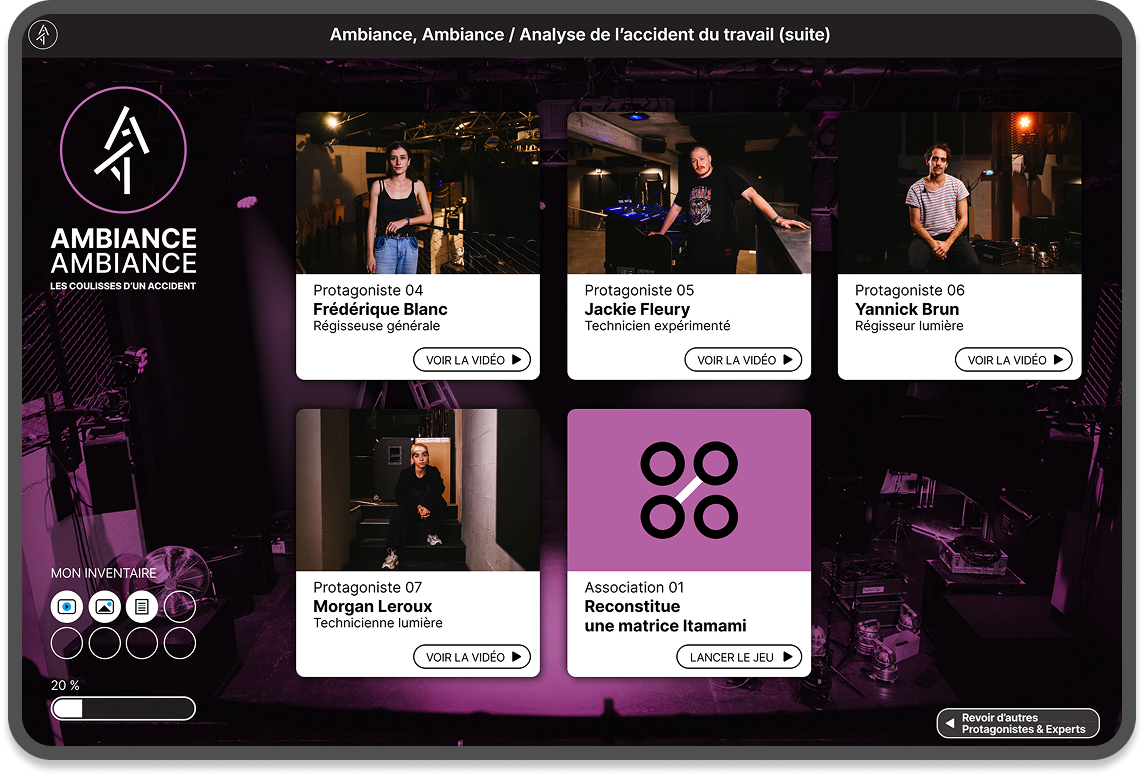 Yunow a réalisé pour les Nuits de Fourvière un jeu sérieux sur la prévention des risques à destination des professionnels du spectacle vivant. Ce “serious game” pour tablette et ordinateur s’utilise en individuel et en groupe. L’identité visuelle a été réalisée en collaboration avec un studio graphique qui a également produit les audiovisuels. 5 étapes permettent de consulter des vidéos de protagonistes et experts qui vont permettre au joueur de répondre correctement aux quiz et à reconstituer une grille d'observation et d'analyse globale de situation de travail (Itamami). À chaque palier de score atteint, le joueur débloque des éléments dans son inventaire et peut poursuivre le jeu vers l’étape suivante.
